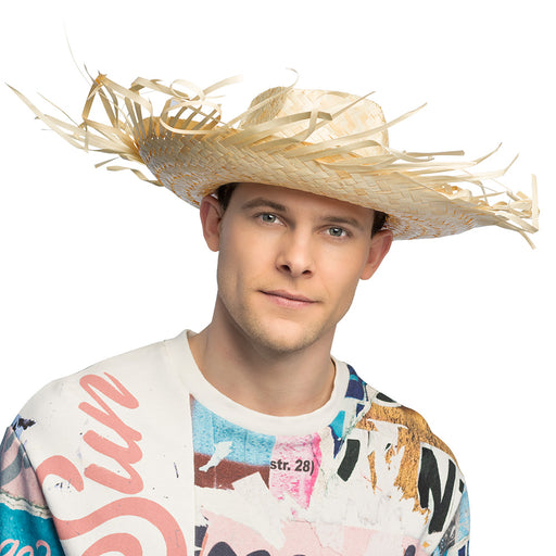 Feestelijke sombrero, ideaal voor een Mexicaans themafeest. De sombrero hoed heeft een doorsnede van 50cm en is gemaakt van gevlochten riet.