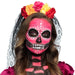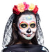 De tiara is rijkelijk versierd met levendige bloemen in verschillende kleuren, die symbool staan voor vreugde, leven en herinnering aan dierbaren. De zwarte sluier voegt een vleugje mysterie en elegantie toe aan het ontwerp, waardoor je eruitziet als een betoverende figuur uit het Day of the Dead feest.