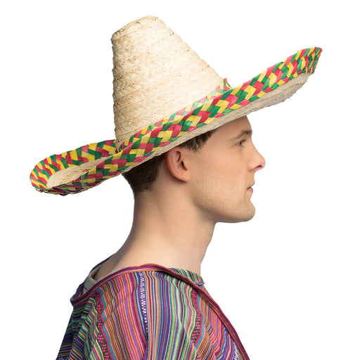 Caramba, deze Mexicaanse strohoed heeft een doorsnede van 48cm en heeft een vrolijke, gekleurde rand. De hoed is perfect voor carnaval of een thema...