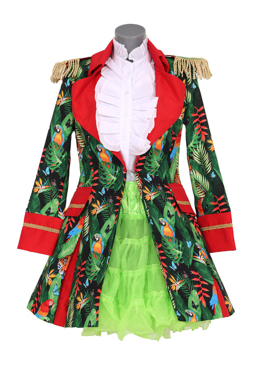 Deze prachtige carnavalsjas voor dames is perfect voor wie op zoek is naar een opvallende en kleurrijke outfit. De jas is versierd met levendige pa...