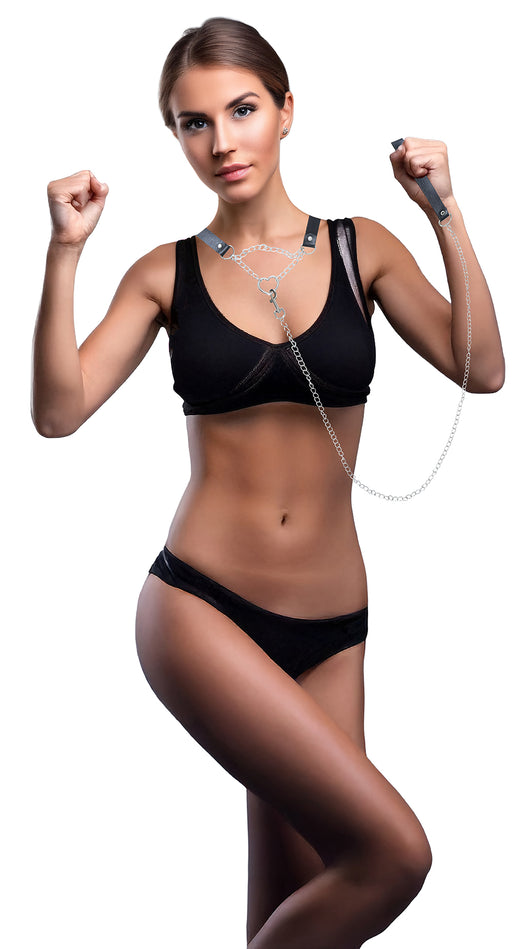 Leren halsband met ketting en handboeien